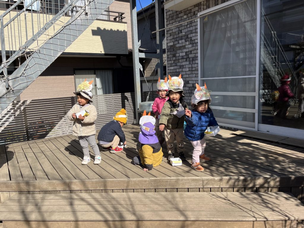 今日は待ちに待った節分の行事。 みんなで一生懸命に作った、カラフルな角がついた「おにの帽子」をかぶって準備万端です!